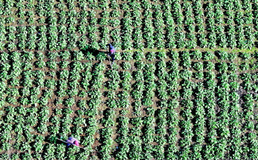 2月8日,裕安区城南镇桃湾村,农民在为油菜追肥、除草,进行农事管理。