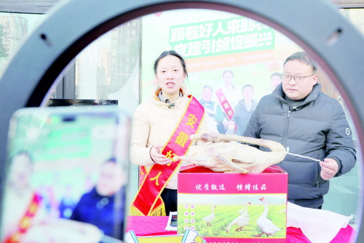 图为“安徽好人”王倩(左一)在和金安区东桥镇罗老庄村负责人一起通过网络直播向网友推荐“皖西白鹅”。